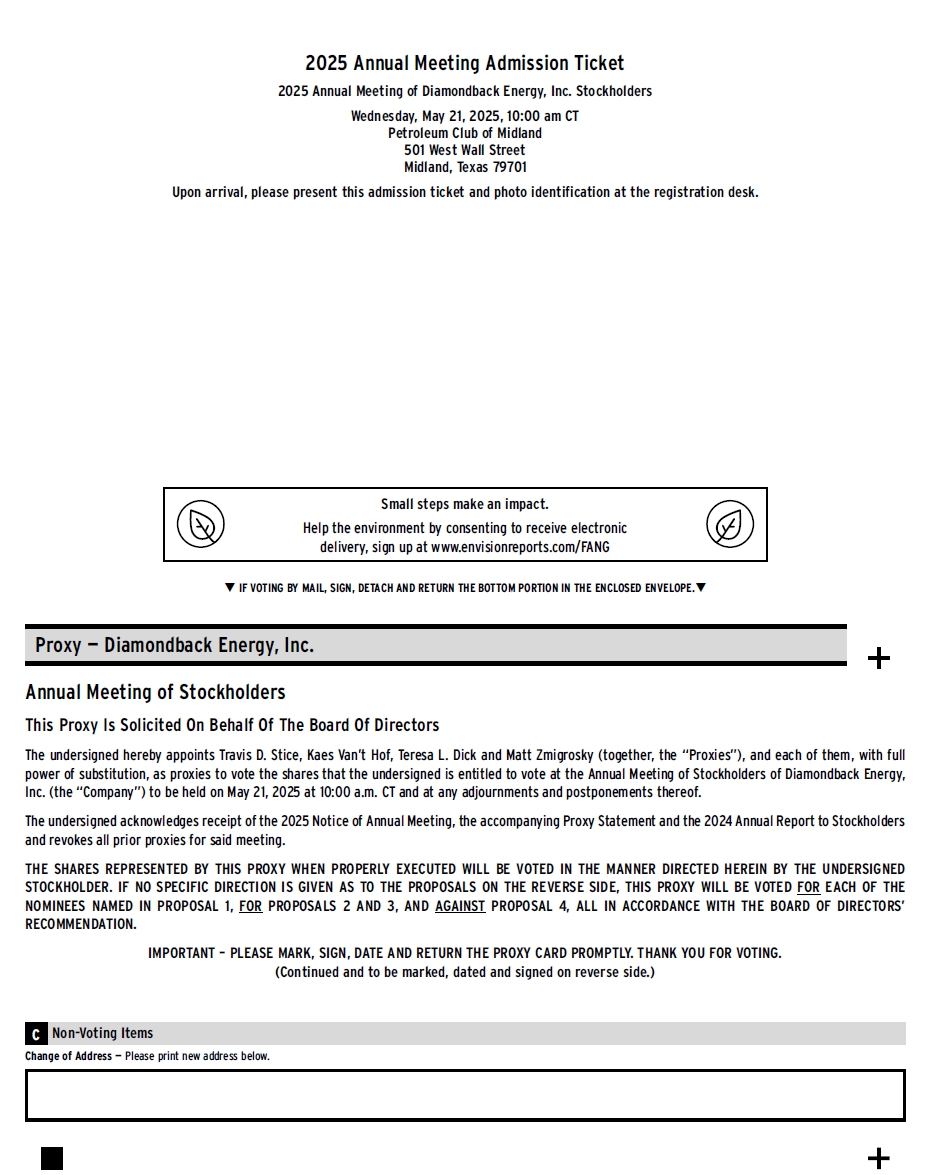 2025 Annual Meeting Admission Ticket 2025 Annual Meeting of Diamondback Energy, Inc. Stockholders Wednesday, May 21, 2025, 10:00 am CT Petroleum Club of Midland 501 West Wall Street Midland, Texas 79701 Upon arrival, please present this admission ticket and photo identification at the registration desk. Small steps make an impact. Help the environment by consenting to receive electronic delivery, sign up at www.envisionreports.com/FANG IF VOTING BY MAIL, SIGN, DETACH AND RETURN THE BOTTOM PORTION IN THE ENCLOSED ENVELOPE. Proxy — Diamondback Energy, Inc. Annual Meeting of Stockholders This Proxy Is Solicited On Behalf Of The Board Of Directors The undersigned hereby appoints Travis D. Stice, Kaes Van’t Hof, Teresa L. Dick and Matt Zmigrosky (together, the “Proxies”), and each of them, with full power of substitution, as proxies to vote the shares that the undersigned is entitled to vote at the Annual Meeting of Stockholders of Diamondback Energy, Inc. (the “Company”) to be held on May 21, 2025 at 10:00 a.m. CT and at any adjournments and postponements thereof. The undersigned acknowledges receipt of the 2025 Notice of Annual Meeting, the accompanying Proxy Statement and the 2024 Annual Report to Stockholders and revokes all prior proxies for said meeting. THE SHARES REPRESENTED BY THIS PROXY WHEN PROPERLY EXECUTED WILL BE VOTED IN THE MANNER DIRECTED HEREIN BY THE UNDERSIGNED STOCKHOLDER. IF NO SPECIFIC DIRECTION IS GIVEN AS TO THE PROPOSALS ON THE REVERSE SIDE, THIS PROXY WILL BE VOTED FOR EACH OF THE NOMINEES NAMED IN PROPOSAL 1, FOR PROPOSALS 2 AND 3, AND AGAINST PROPOSAL 4, ALL IN ACCORDANCE WITH THE BOARD OF DIRECTORS’ RECOMMENDATION. IMPORTANT – PLEASE MARK, SIGN, DATE AND RETURN THE PROXY CARD PROMPTLY. THANK YOU FOR VOTING. (Continued and to be marked, dated and signed on reverse side.) Change of Address — Please print new address below.